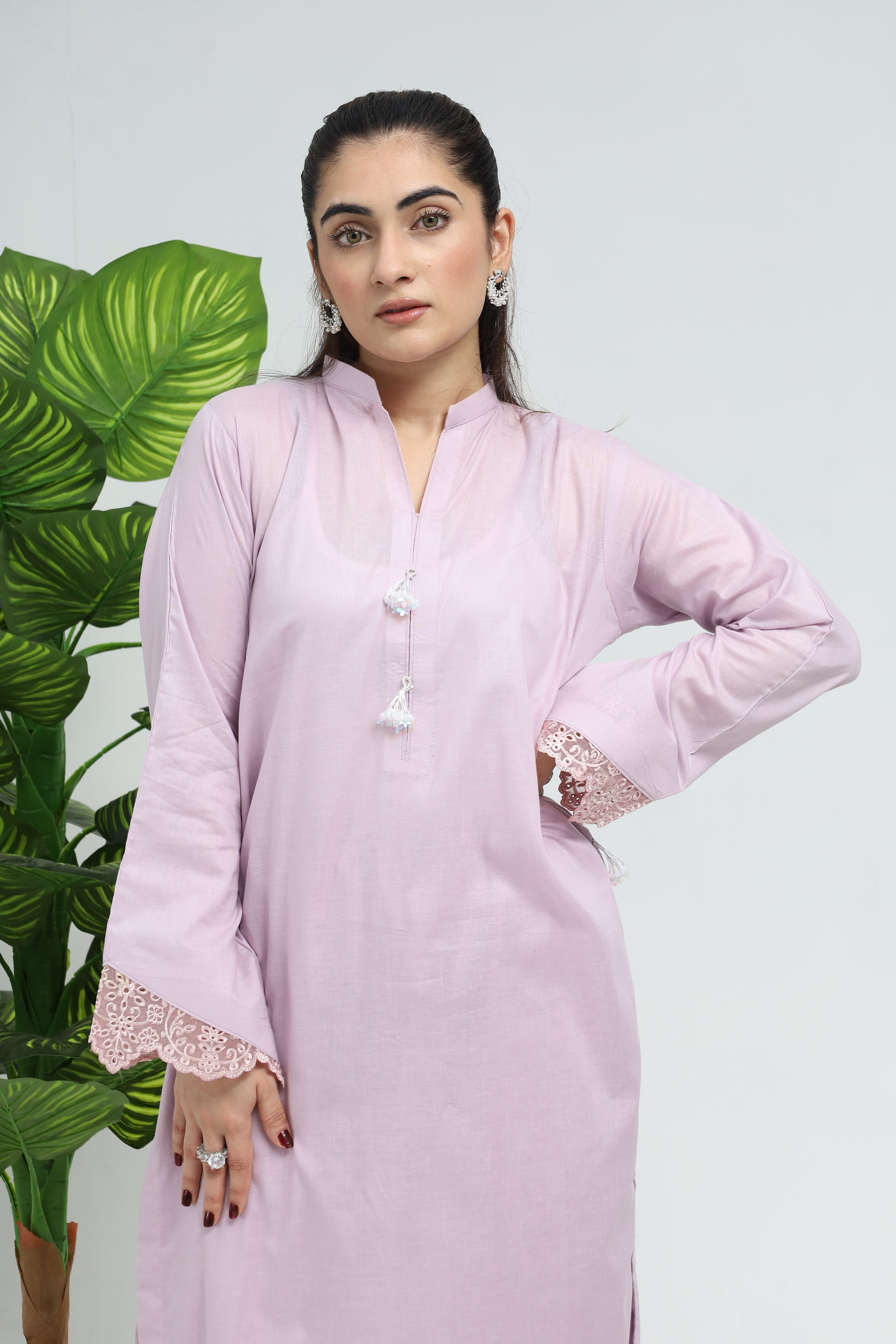 This graceful soft lavender cotton suit features a ban neck kameez adorned with three-tiered tassels and lace sleeves, creating a delicate and eye-catching design. It is paired with straight trousers enhanced by scalloped hems, offering a refined and flowing silhouette. Perfect for casual outings or special occasions, this suit embodies timeless elegance and comfortable wear.