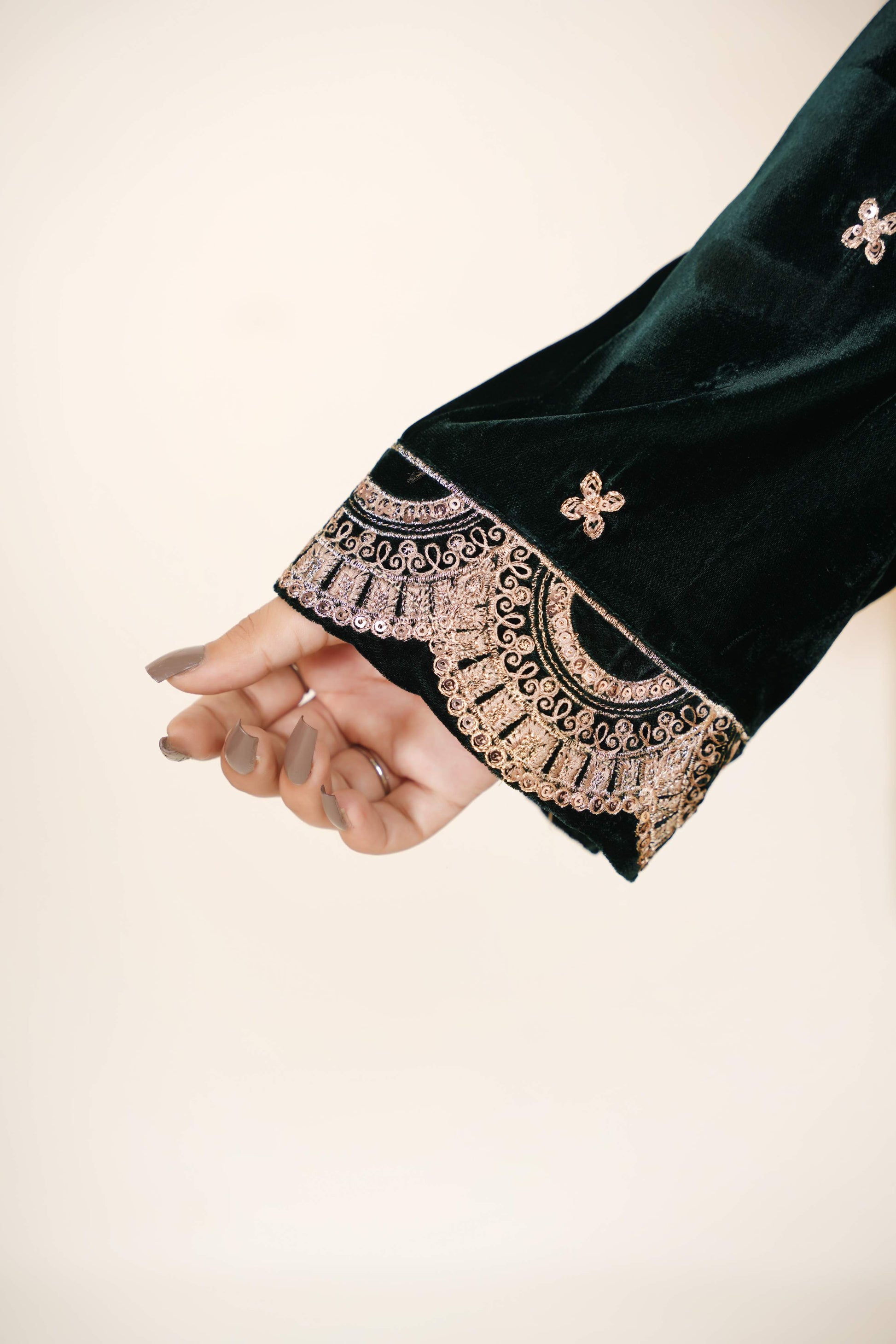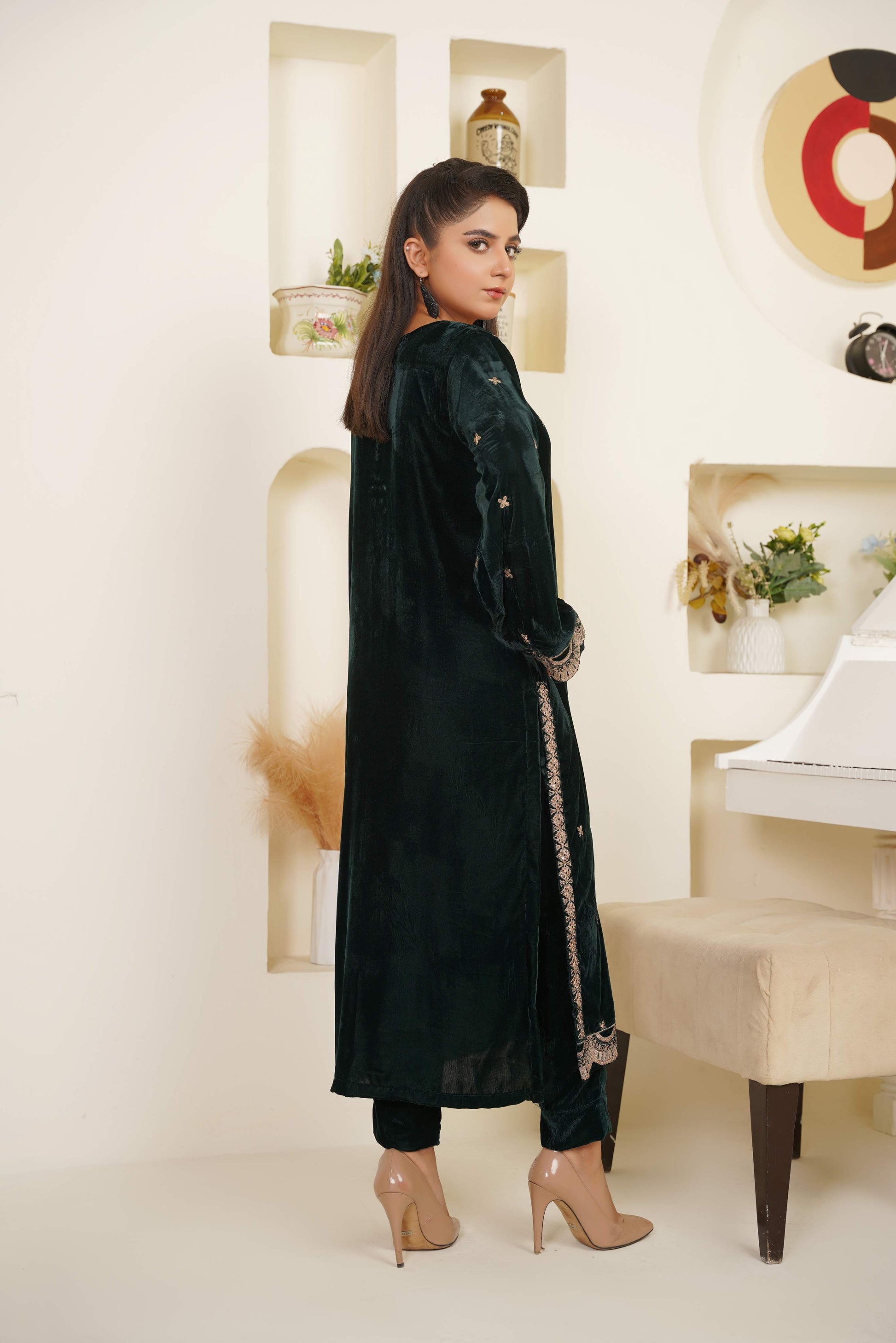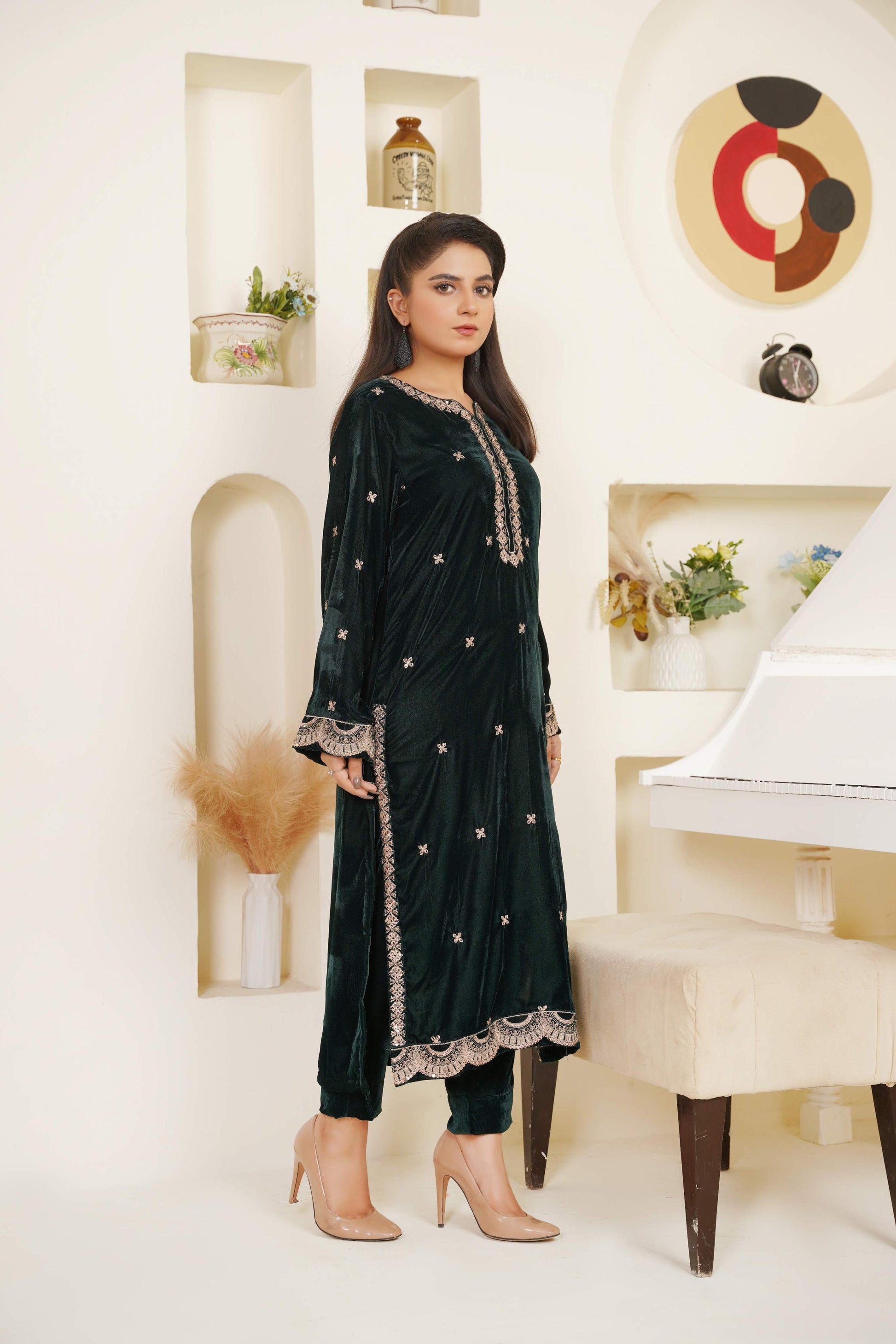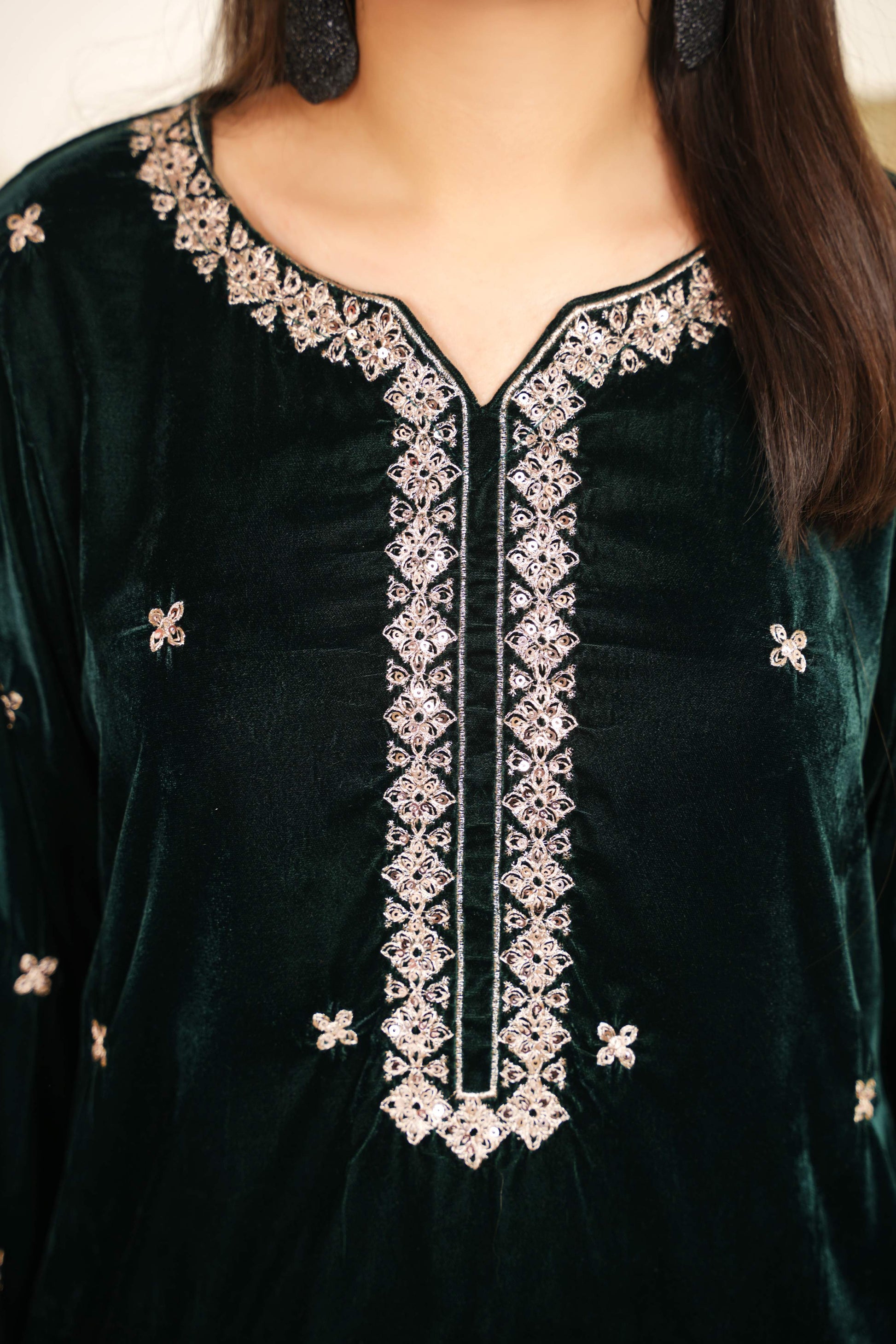Draped in bottle-green velvet, this two-piece celebrates quiet elegance — detailed with soft copper-silver threadwork that whispers tradition without saying a word.