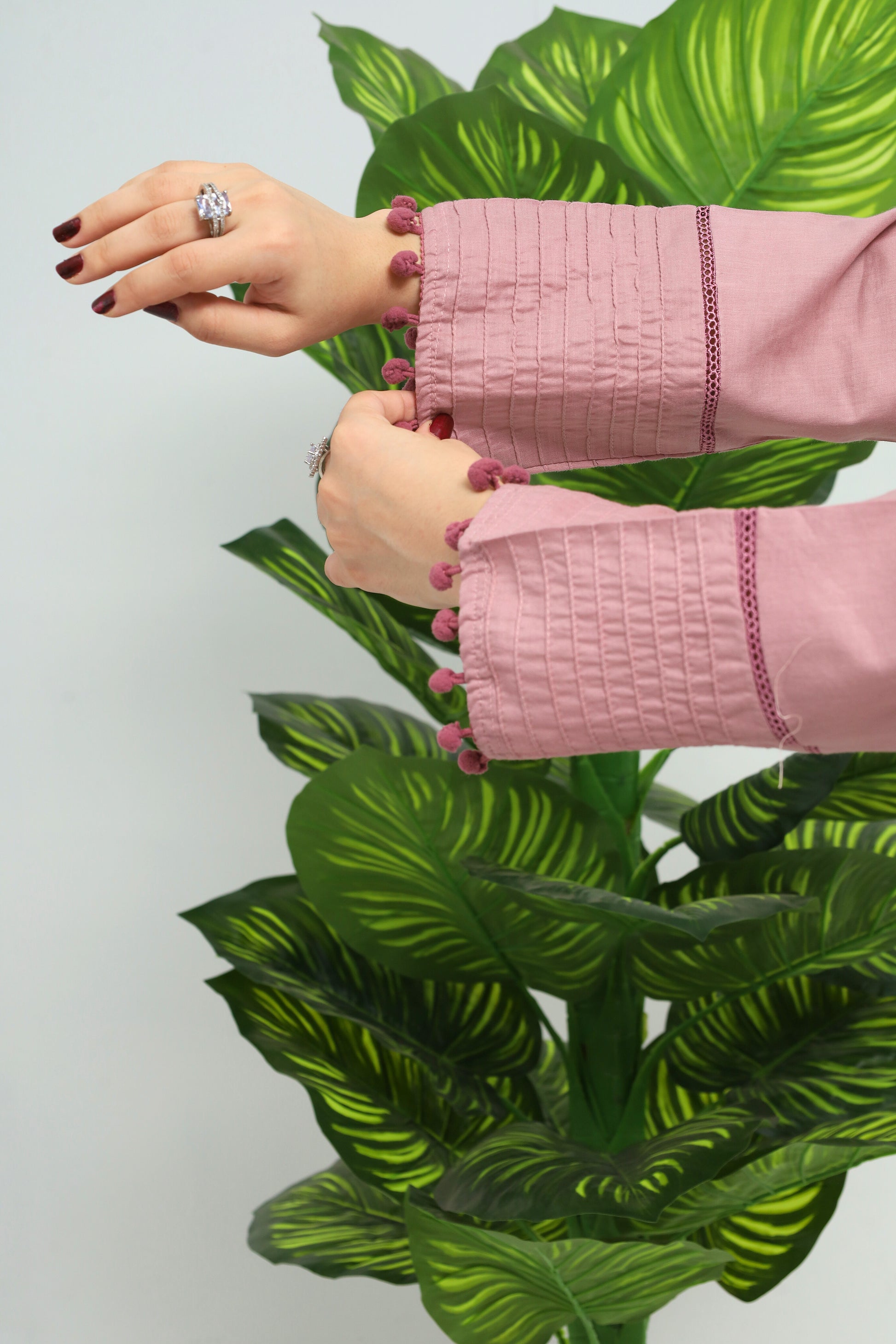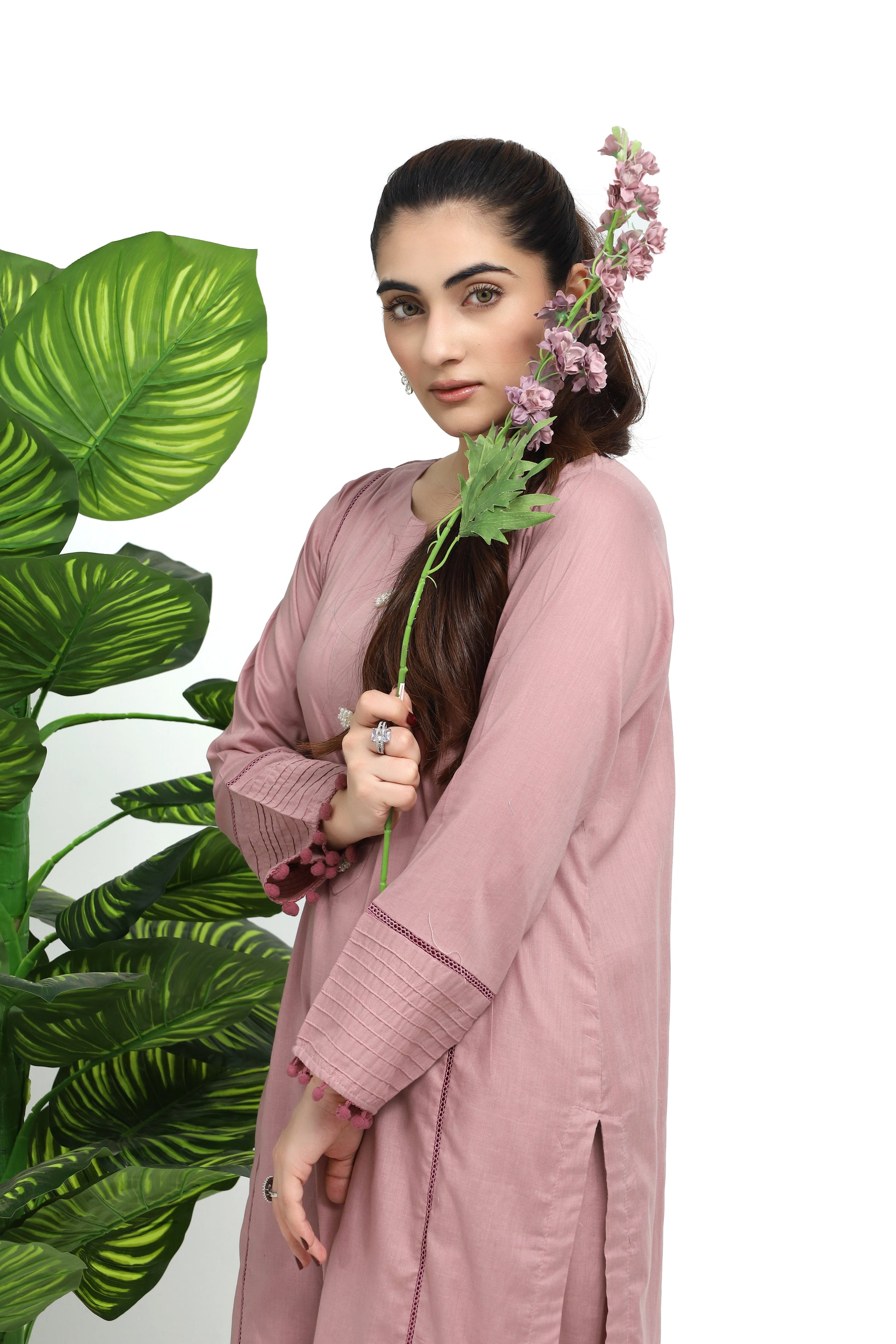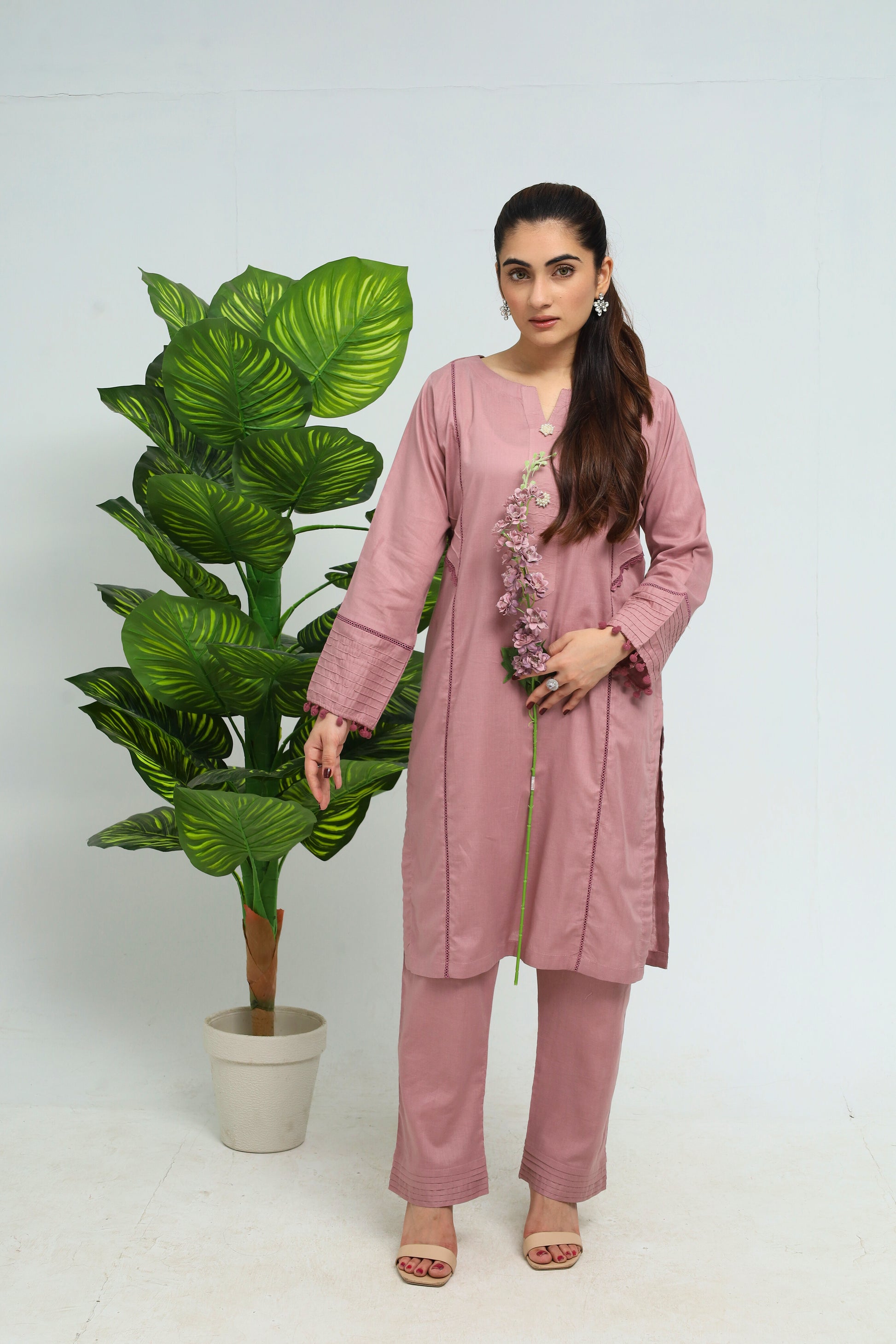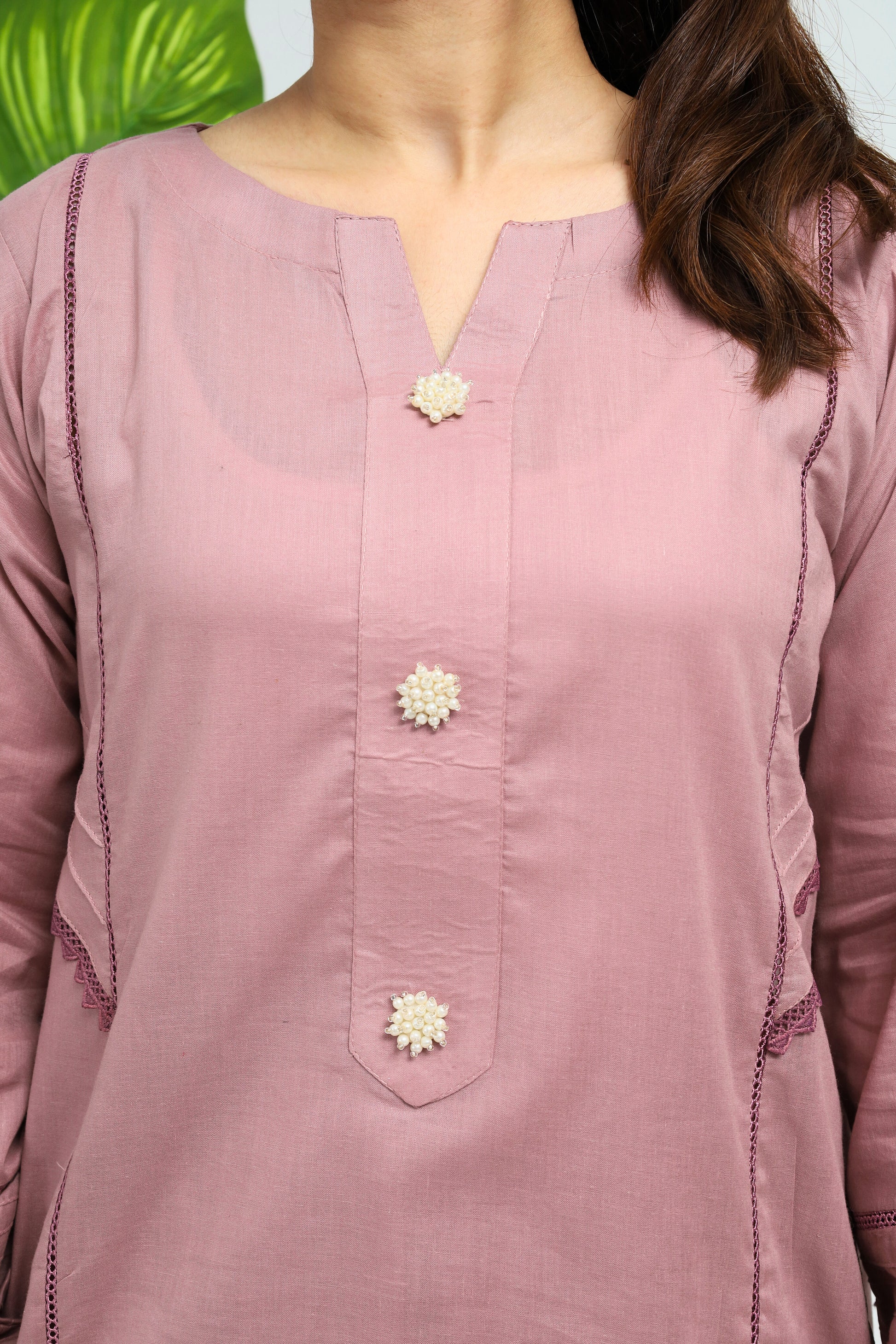 This elegant powder pink cotton suit features a beautifully crafted shirt with a boat neckline, adorned with pearl buttons for a touch of refinement. The shirt includes pleated sleeves with decorative panels, adding a unique and stylish dimension. It is paired with straight trousers, enhanced by pleated hems that lend a soft, flowing finish. Perfect for casual outings or special occasions, this suit combines delicate charm with versatile appeal.
