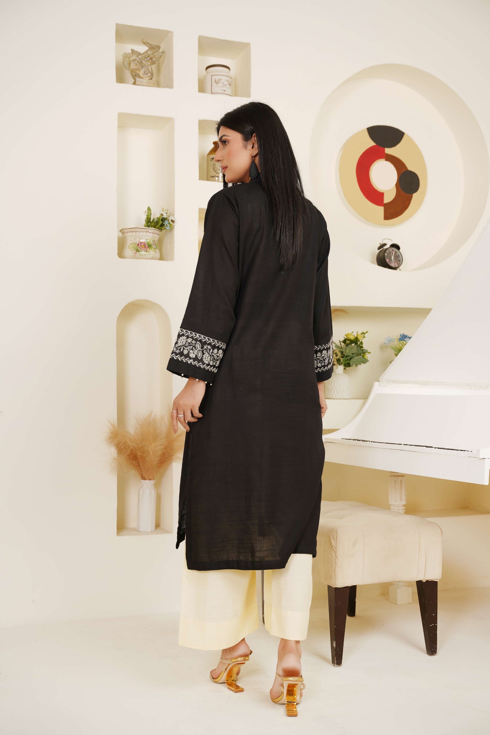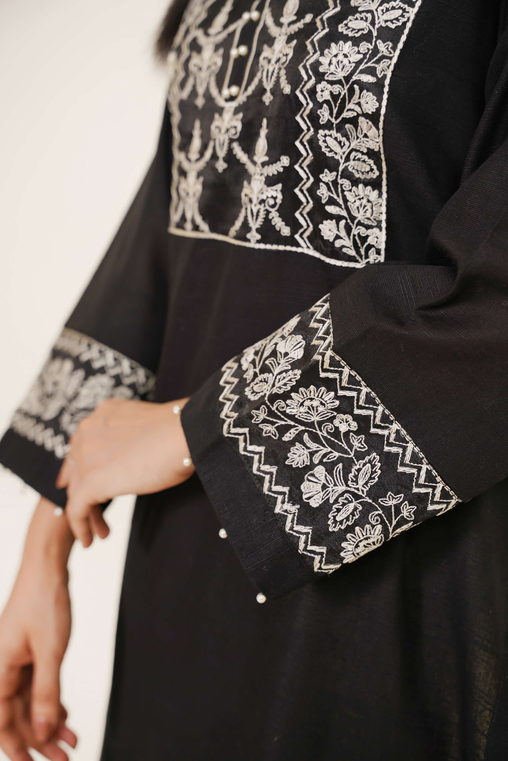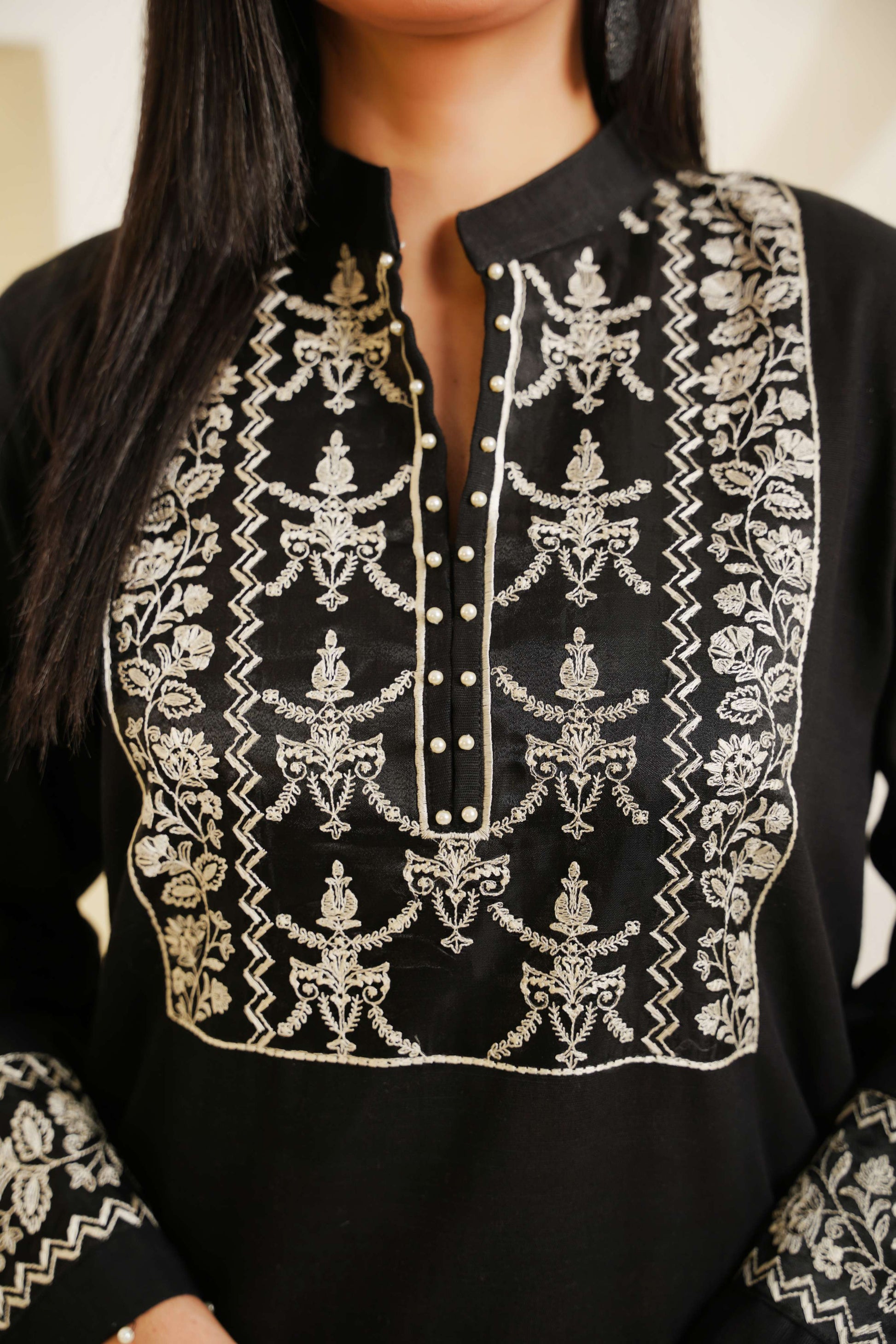 Sleek. Subtle. Uncompromising. A modern dialogue between black and cream, accented by beadwork that catches the softest winter light.