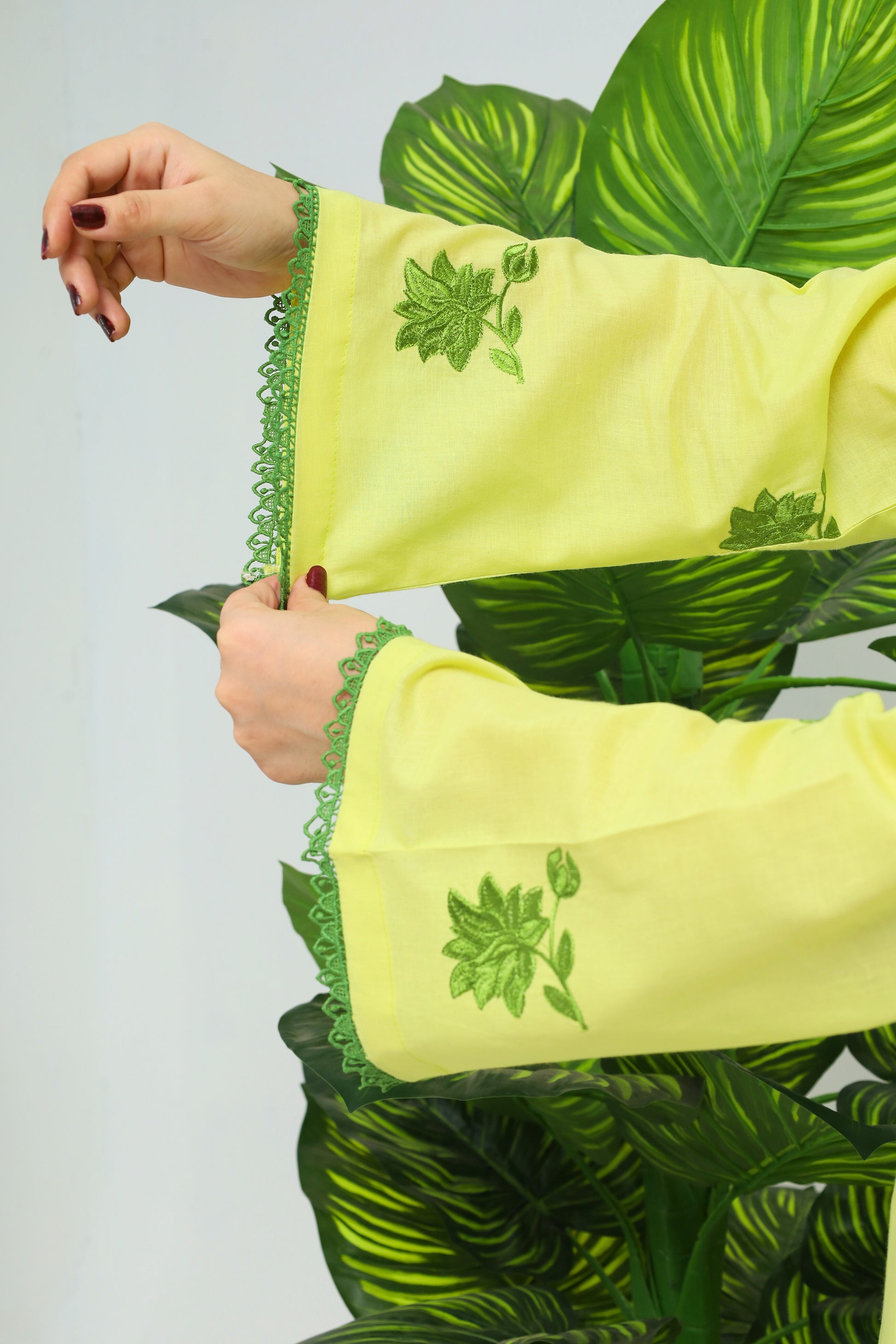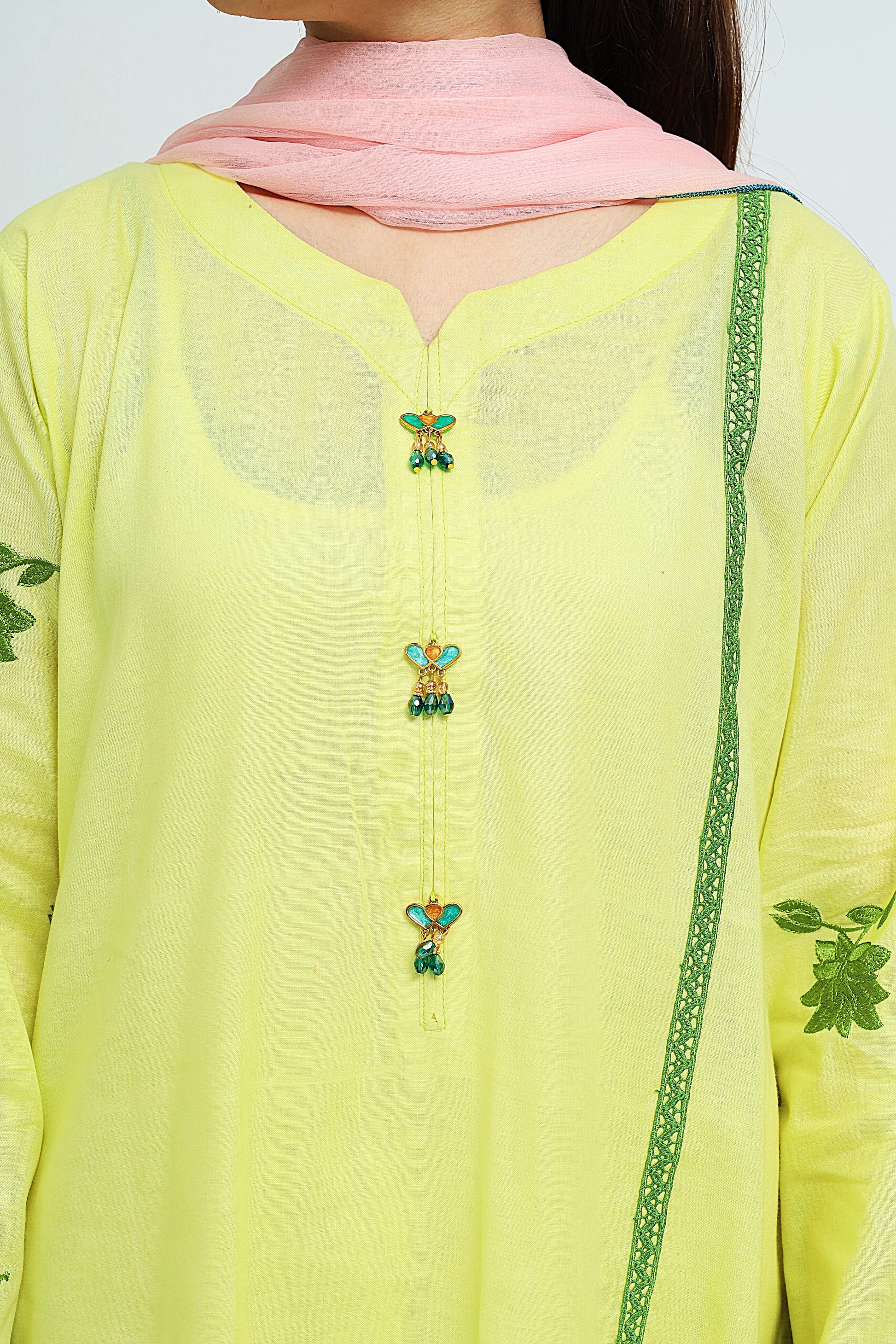 This striking lemon yellow cotton lawn suit showcases a beautifully designed kameez with a round neckline, enhanced by bell sleeves adorned with intricate embroidery and a delicate lace hem for a touch of elegance. It is paired with straight trousers that offer a clean, streamlined fit. The ensemble is completed by a powder pink kinker chiffon dupatta, finished with charming tassels that add a festive flair. Ideal for celebratory events or casual gatherings, this suit radiates joy and sophistication.