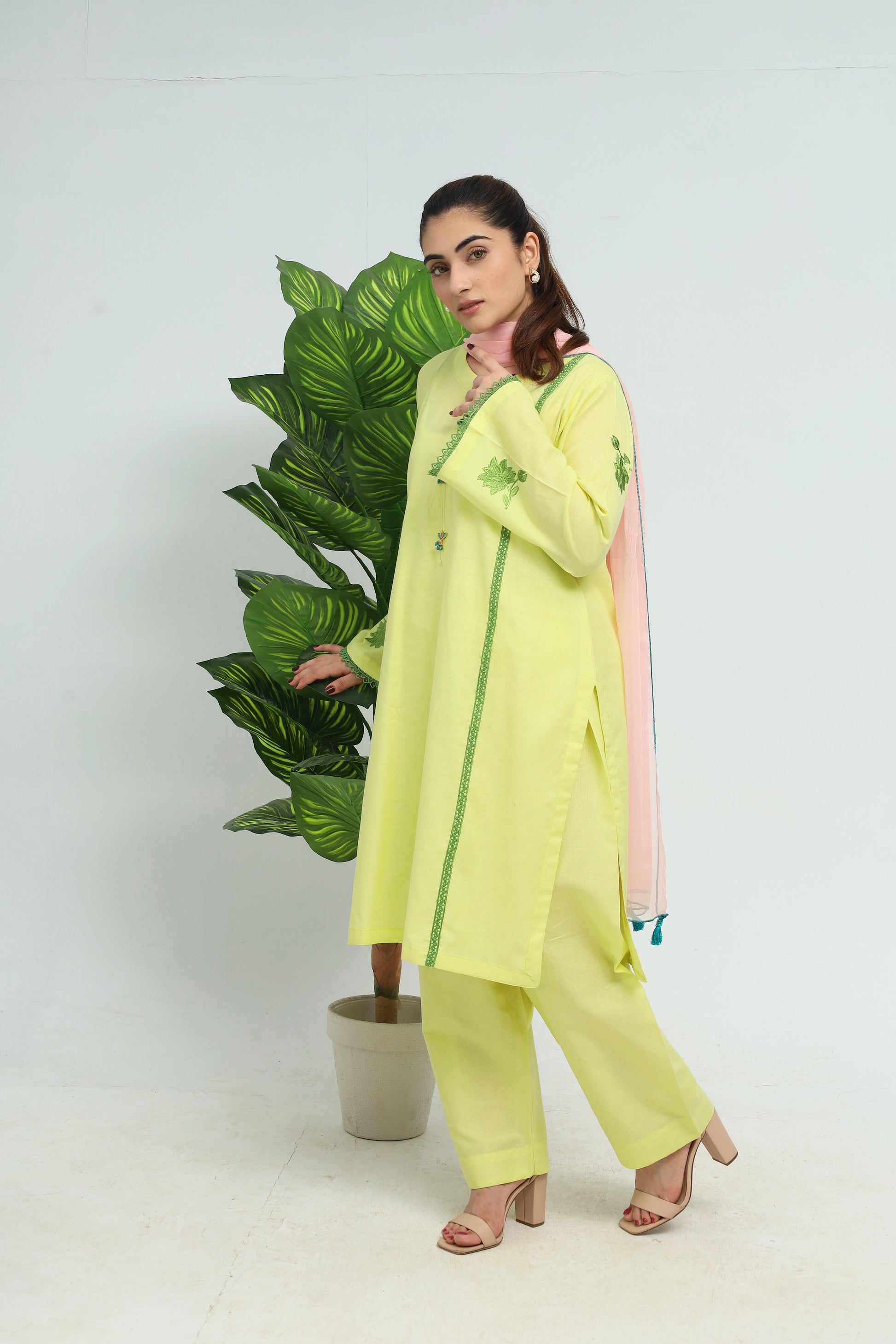 Kameez & Trouser: Lemon Yellow Dupatta: Powder Pink