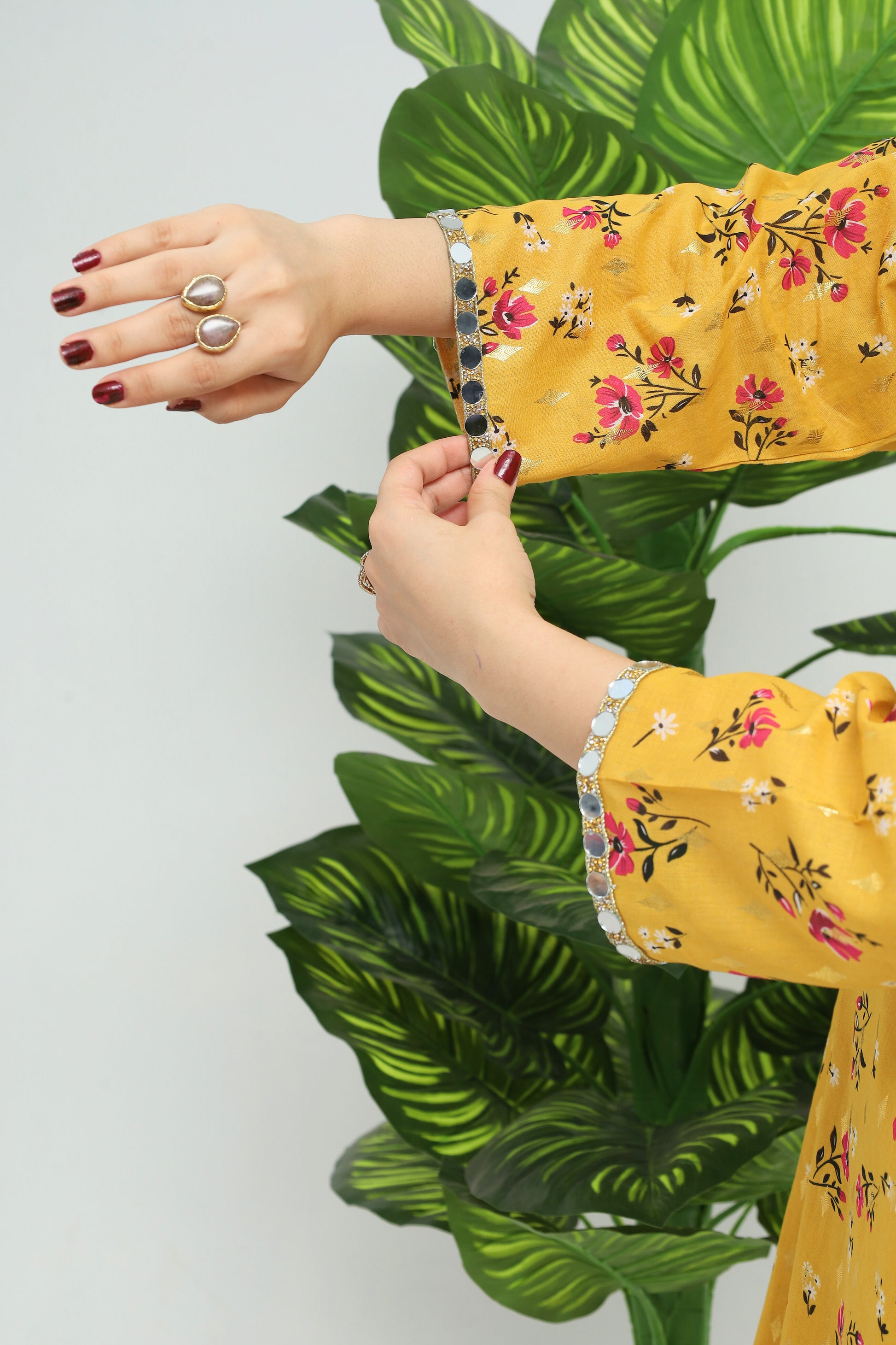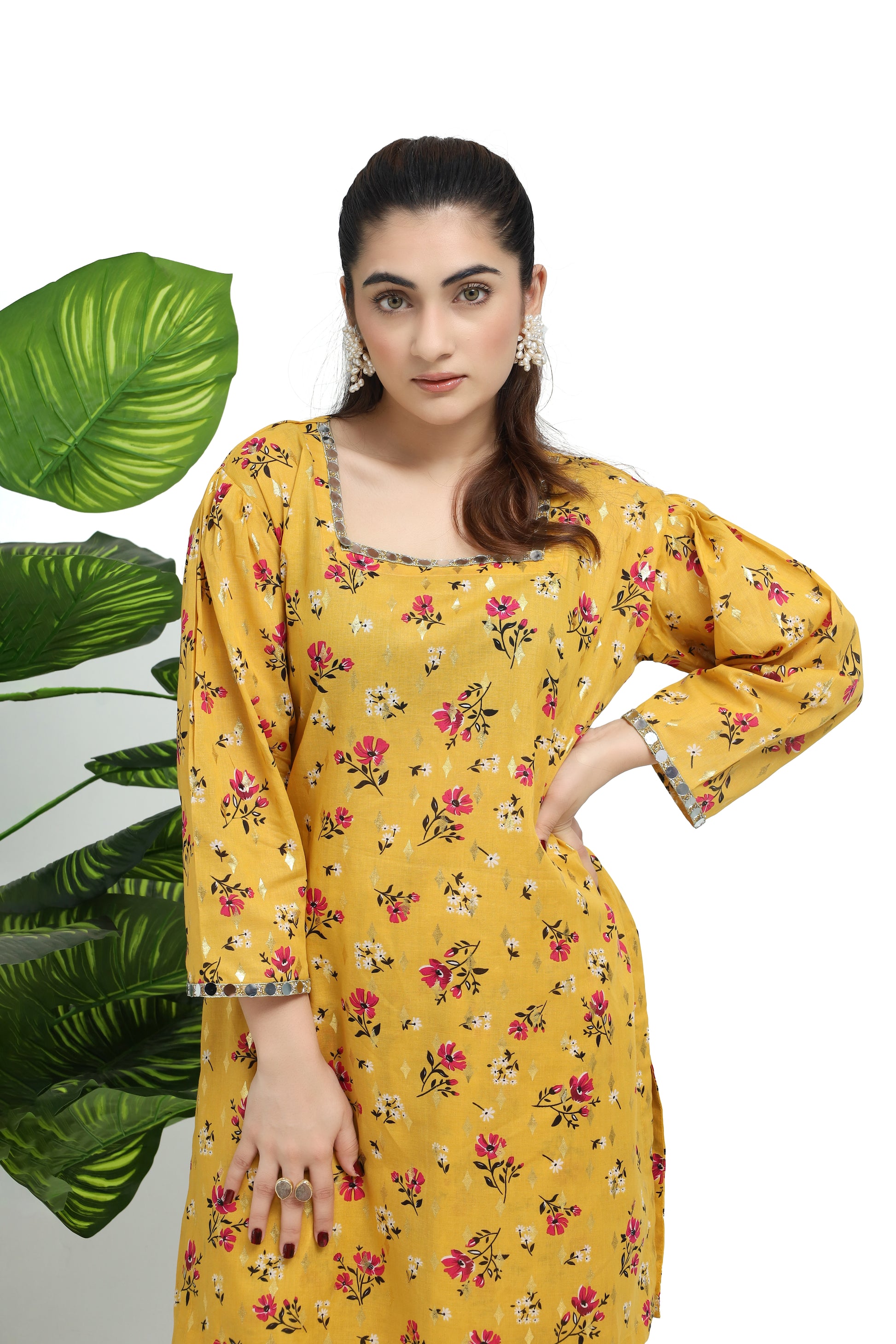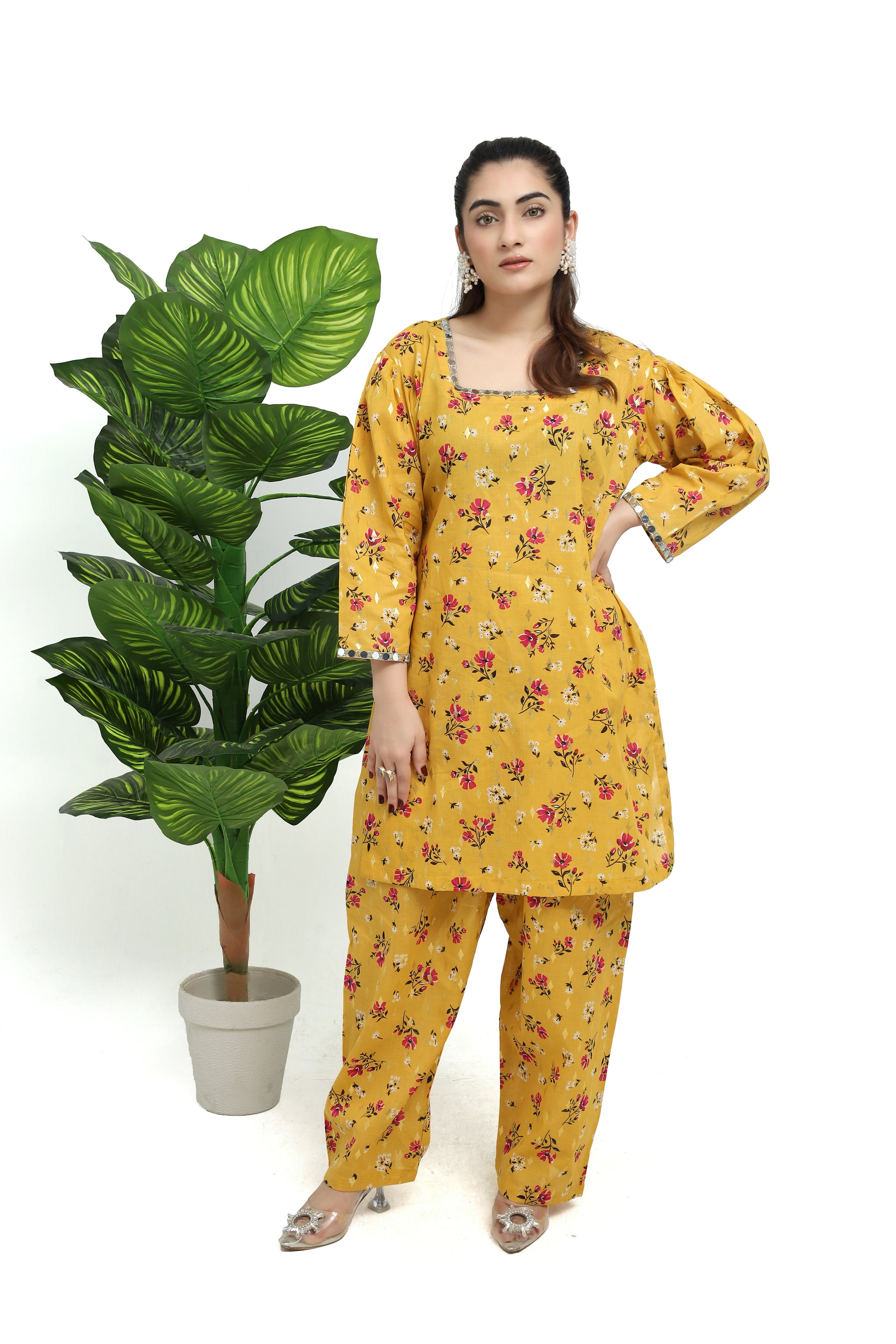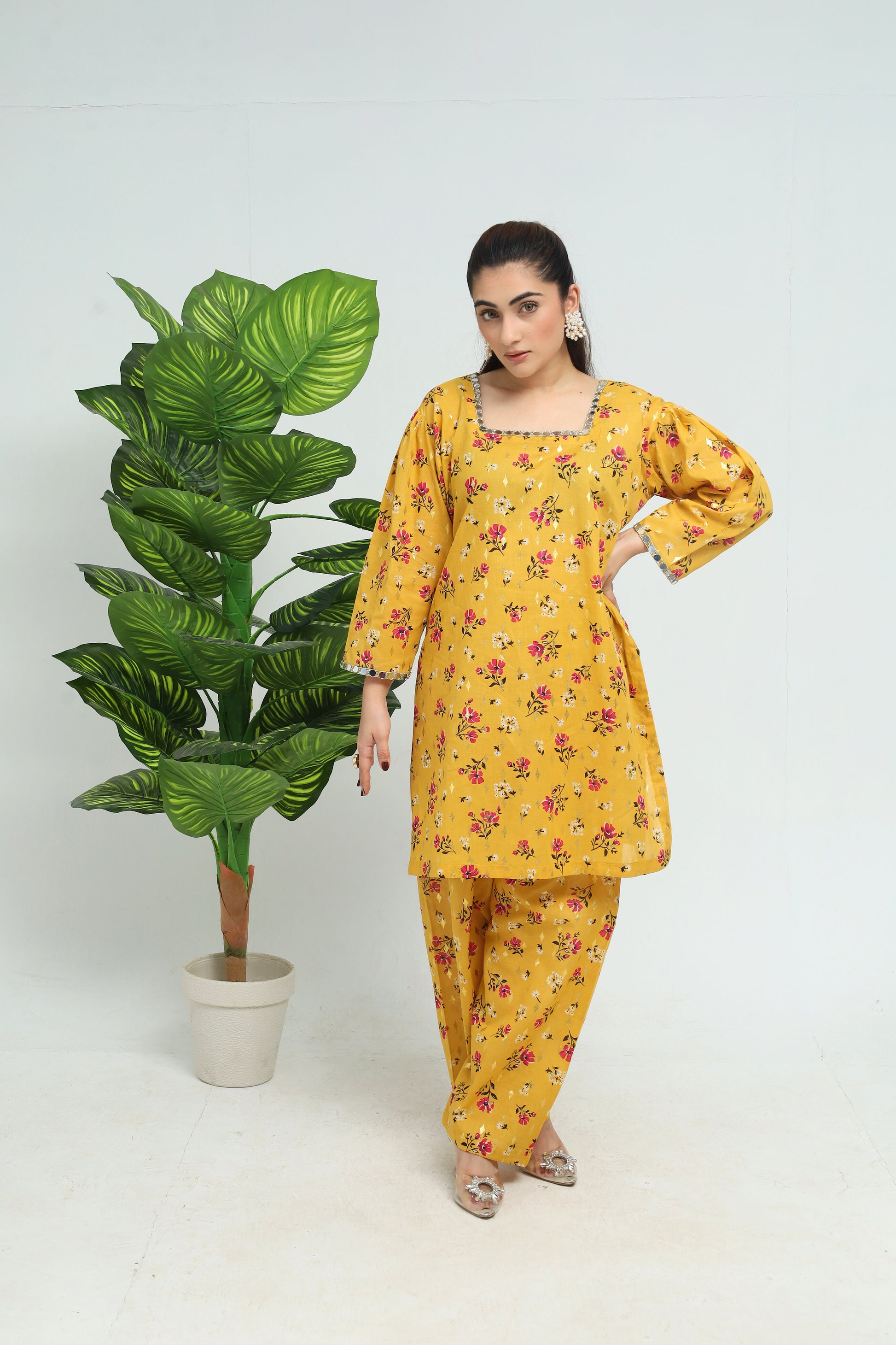 This delightful light mustard cotton lawn suit showcases a kameez with a square neckline, crafted from lightweight fabric for effortless comfort. It features puffed sleeves embellished with mirror lace, adding a touch of glamour. Paired with it is a wide flare shalwar adorned with a matching magenta tulip print, creating a harmonious and vibrant look. Ideal for casual gatherings or festive celebrations, this suit offers a perfect blend of elegance and ease.